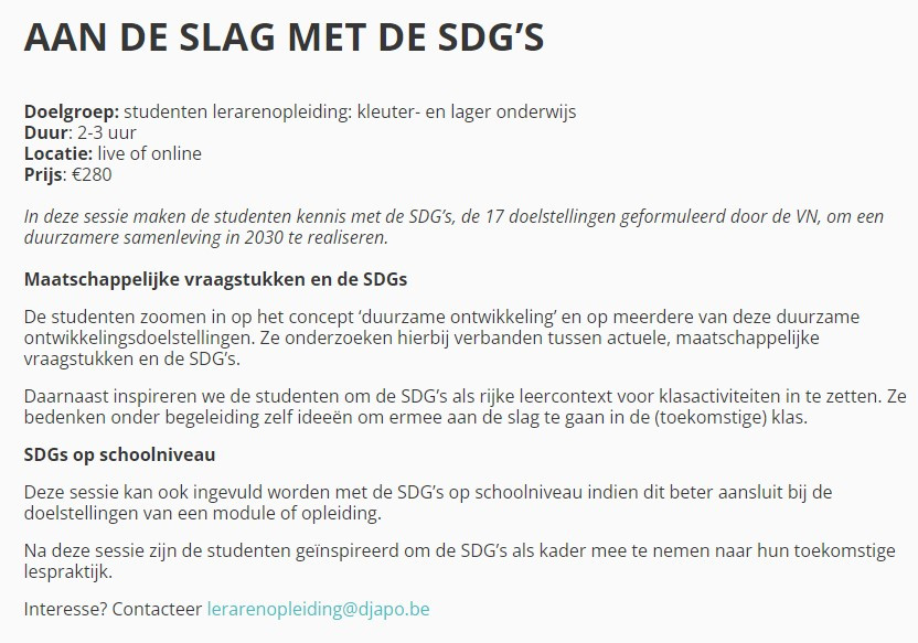 In deze sessie maken de studenten lerarenopleiding (kleuter- en lager onderwijs) kennis met de SDG’s, de 17 doelstellingen geformuleerd door de VN, om een duurzamere samenleving in 2030 te realiseren. Maatschappelijke vraagstukken en de SDGs. De studenten zoomen in op het concept ‘duurzame ontwikkeling’ en op meerdere van deze duurzame ontwikkelingsdoelstellingen. Ze onderzoeken hierbij verbanden tussen actuele, maatschappelijke vraagstukken en de SDG’s. Daarnaast inspireren we de studenten om de SDG’s als rijke leercontext voor klasactiviteiten in te zetten. Ze bedenken onder begeleiding zelf ideeën om ermee aan de slag te gaan in de (toekomstige) klas. SDGs op schoolniveau. Deze sessie kan ook ingevuld worden met de SDG’s op schoolniveau indien dit beter aansluit bij de doelstellingen van een module of opleiding. Na deze sessie zijn de studenten geïnspireerd om de SDG’s als kader mee te nemen naar hun toekomstige lespraktijk.
