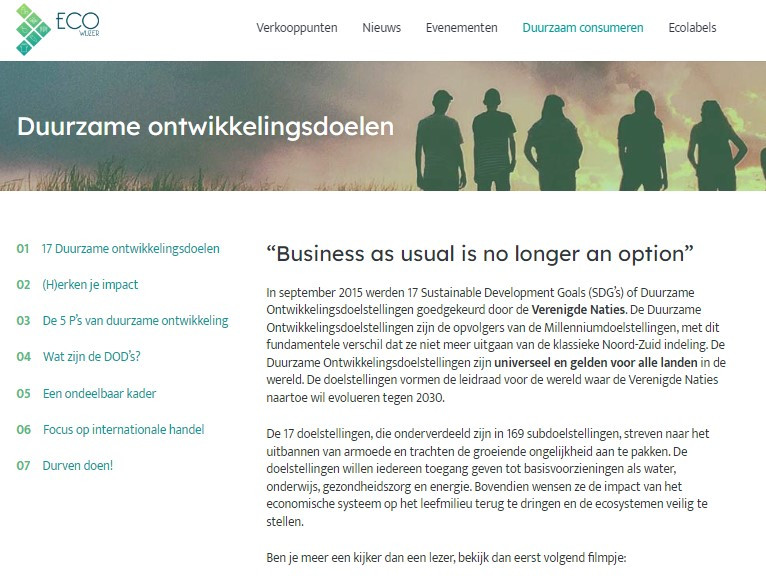 De Ecowijzer zet in op de doelstellingen; verantwoorde consumptie en productie (nr. 12), klimaatactie (nr. 13) en duurzame gemeenten (nr. 11). De website helpt je op weg met informatie en verkoopadressen voor jouw duurzame aankopen. Je kan als consument in deze gids gericht op zoek gaan naar de verkooppunten van lokale, biologische, eerlijke en duurzame producten. De Ecowijzer leidt je langs de ecolabels, somt de voordelen op en legt het accent van de voorgestelde producten bloot. Op die manier willen de gemeenten je warm maken voor de enorme voordelen die deze producten bieden.