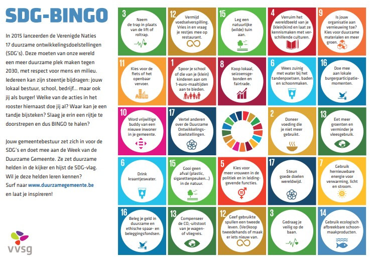 Bron https://www.vvsg.be/Leden/Internationaal/SDG-pagina/SDG-materiaal/A5_liggende_WDG%20Bingokaart_2406… Organisatie VVSG Omschrijving Leuk materiaal om burgers kennis te laten maken met de SDG's en hen te inspireren tot persoonlijke, haalbare acties. Tool talen Nederlands Eindgebruiker Citoyen ne Leeftijd 18+ Doelstelling Ontdekken Gebruiksgemak Beginner Kost Gratis SDG’s vermeld Expliciet Concerned SDG's Principles: People Ja Principles: Planet Ja Principles: Peace Ja Principles: Prosperity Ja Principles: Partnership Ja Leave no one behind Yes Differentiated focus on more vulnerable groups? Implicit Intergenerational solidarity? Implicit International solidarity? Implicit