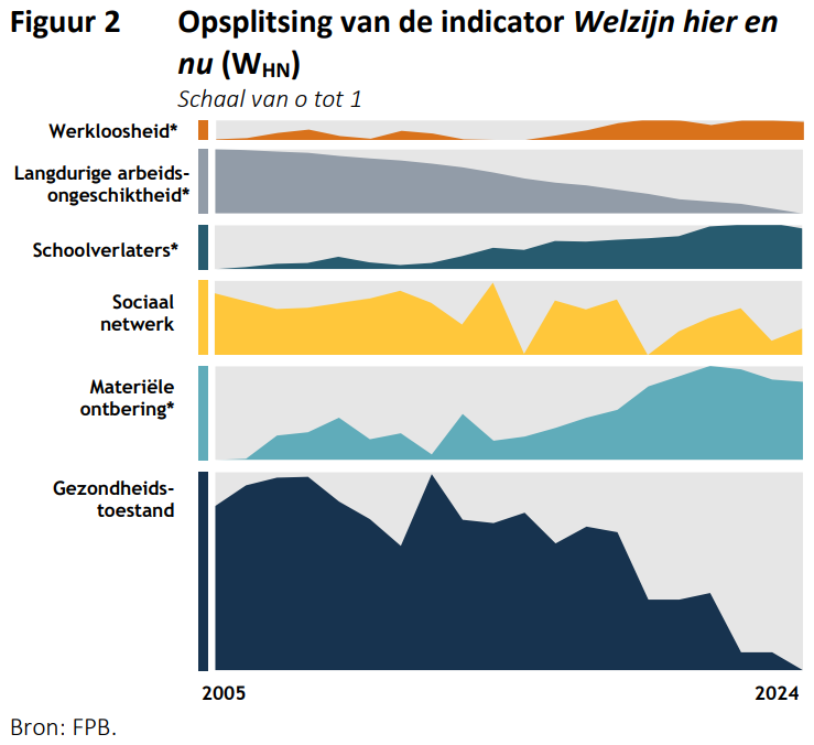Een ander verontrustend signaal uit het rapport: de algemene welzijnsindicator bereikte in 2024 het laagste niveau sinds 2005. Dit is te wijten aan een verslechtering van de lichamelijke en geestelijke gezondheid en aan een recente achteruitgang van de sociaaleconomische indicatoren, onder meer ernstige materiële ontbering. Het gaat bijvoorbeeld om tijdig betalingen kunnen doen, een onverwachte uitgave kunnen doen of de woning degelijk kunnen verwarmen.
