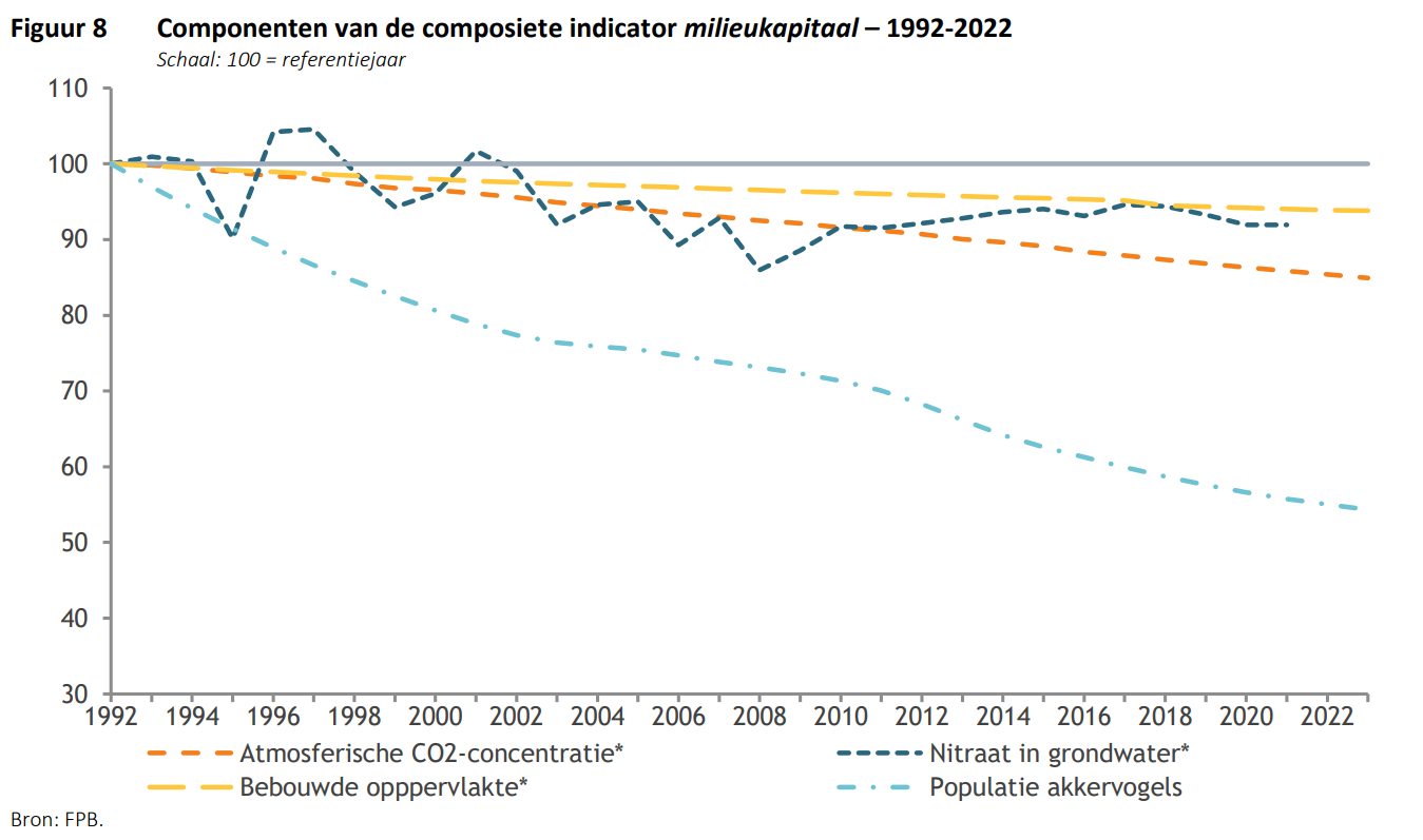 Het rapport onderzoekt ook de evolutie van de middelen die nodig zijn om het welzijn van toekomstige generaties te garanderen. Het menselijk en sociaal kapitaal zijn het afgelopen decennium licht gestegen, terwijl het economisch kapitaal duidelijk toeneemt. Het milieukapitaal daarentegen, dat de natuurlijke hulpbronnen en alle levende soorten omvat, is in dertig jaar tijd met 21 % gedaald. De indicator van het subkapitaal Biodiversiteit is op zijn beurt met bijna 45 % gedaald.