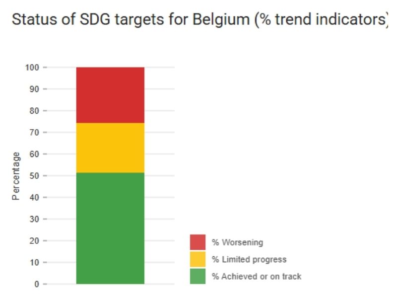 De trendanalyse van de SDG-indicatoren voor België toont een gemengd beeld: ongeveer 50% van de indicatoren is bereikt of op schema, circa 25% toont beperkte vooruitgang en circa 25% gaat achteruit.