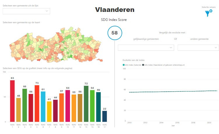 Op deze website kan je het SDG-profiel van elke gemeente in Vlaanderen raadplegen. Een selectie van indicatoren voor alle SDG’s brengt de lokale situatie in beeld. We willen met versie 2024 ook de doelgroep verruimen naar bovenlokale en non-profit organisaties die, door de toevoeging van nieuwe mogelijkheden, nu ook meer nuttige informatie uit de tool kunnen halen.